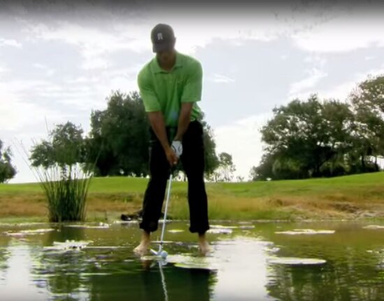 Тайгер Вудс бъет по мячу который лежит на поверхности водоема.