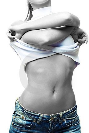 3. Женщина зачастую, в отличие от мужчины, никогда не снимает футболку, захватив её на спине.